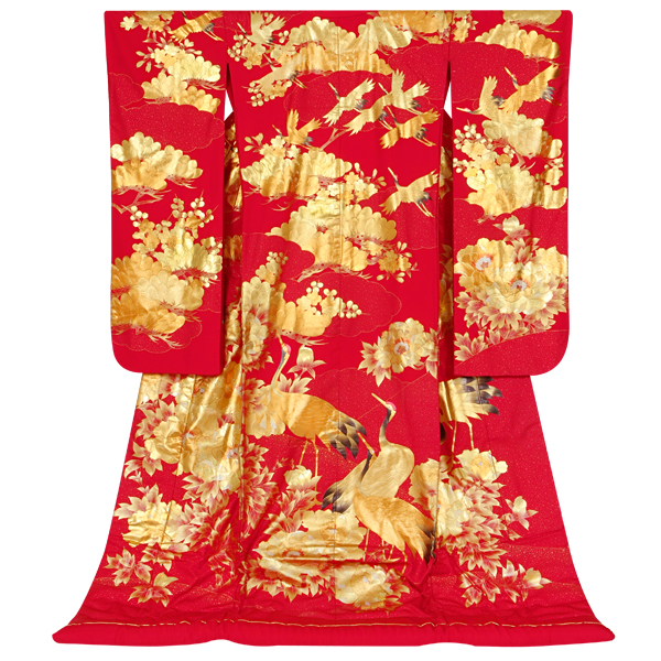神前挙式に着る和装の白い花嫁衣裳で、掛け下といわれる白一色の振袖の上に掛ける着物。地模様は晴れの日に相応しい品格あるおめでたい古典文様が織られてます。 |