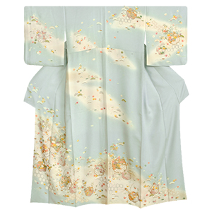 絵羽模様の社交着。広げると一枚の絵に見えるような縫い目でとぎれない絵画風の模様。フォーマルな席に未婚、既婚を問わす着用出来ます。 |