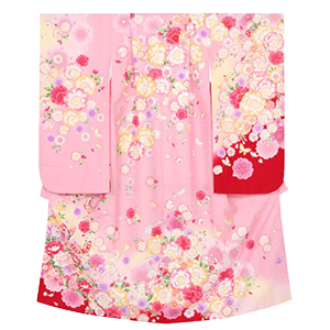 着物 三歳にふさわしく、華やかで可愛らしいものを揃えています。扱いの楽なポリエステル100%使用。 |