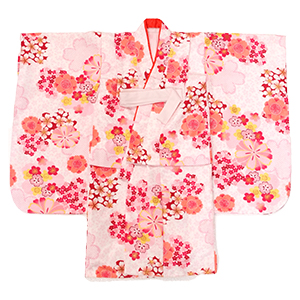 着物 三歳にふさわしく、可愛らしいものを揃えています。扱いの楽なポリエステル100%使用。 |