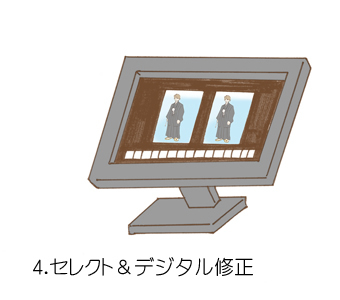 すべてのカットをコンピューターのモニターに映し出し、沢山のカットの中から好きな写真が選べます。満足のいく写真をお選び下さい。